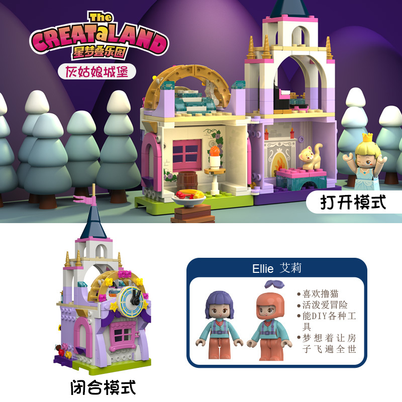 可以說每一個小朋友都聽說過《灰姑娘》的故事,也許是媽媽講述的,也許是從故事書中看的,也許是從電視里看到的,但也有可能是自己搭建出來的。灰姑娘城堡,為小朋友呈現一個立體的故事場景。城堡是三層樓的設計,一樓里,小貓正在壁爐旁邊舒服的取暖。二樓是一個小花園,這里種滿了小花小草,也許南瓜也是種在這里的哦!頂樓里,會不會藏著灰姑娘的水晶鞋,南瓜車呢?屋子上方掛著的時鐘又快到十二點了,答案即將揭曉!
