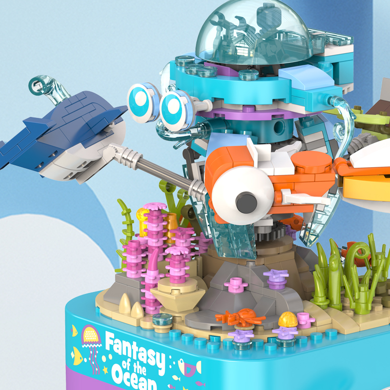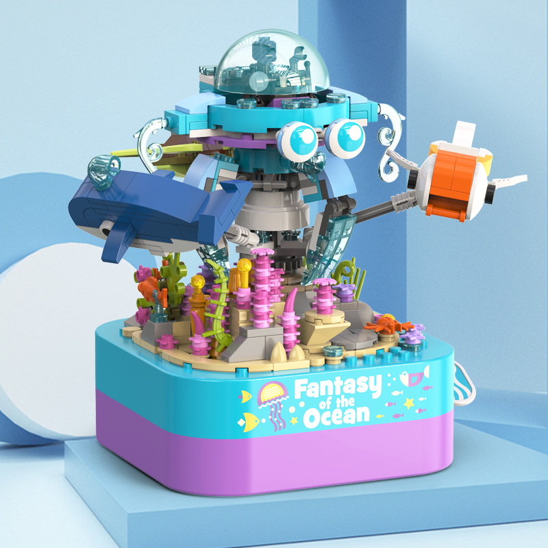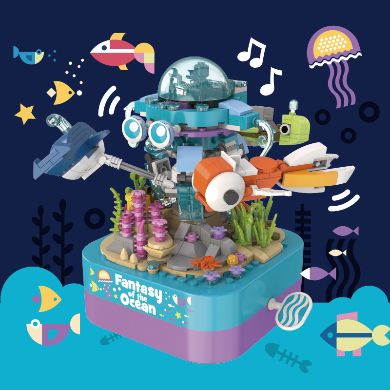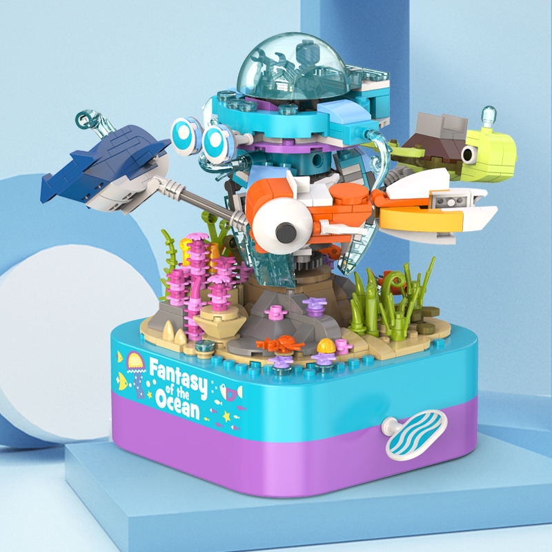 將積木與音樂盒完美結(jié)合,好玩又時尚。純機械動力設計更環(huán)保,音樂盒發(fā)條轉(zhuǎn)動帶動整個海洋館旋轉(zhuǎn),益智拼搭,時尚美觀,還能充當家居精品擺件。